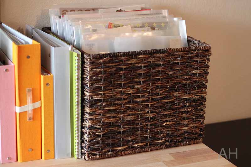 Also the brown basket is from Target. I love that it fits 12x12 papers in it. I have my current favorites and current projects in it in plastic envelope sleeves from Hobby Lobby. I also store alphabet, number and label/border stickers in sleeves here. I really like having it so handy.
